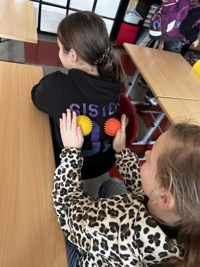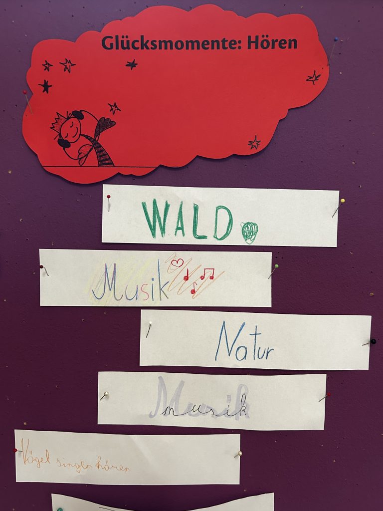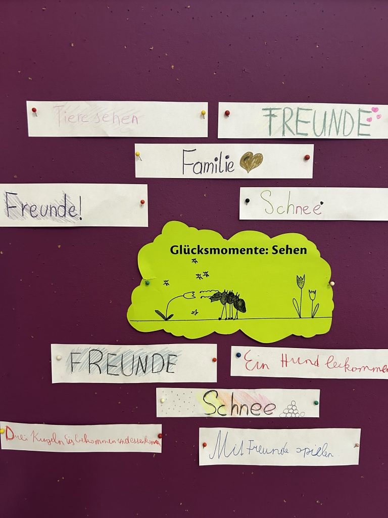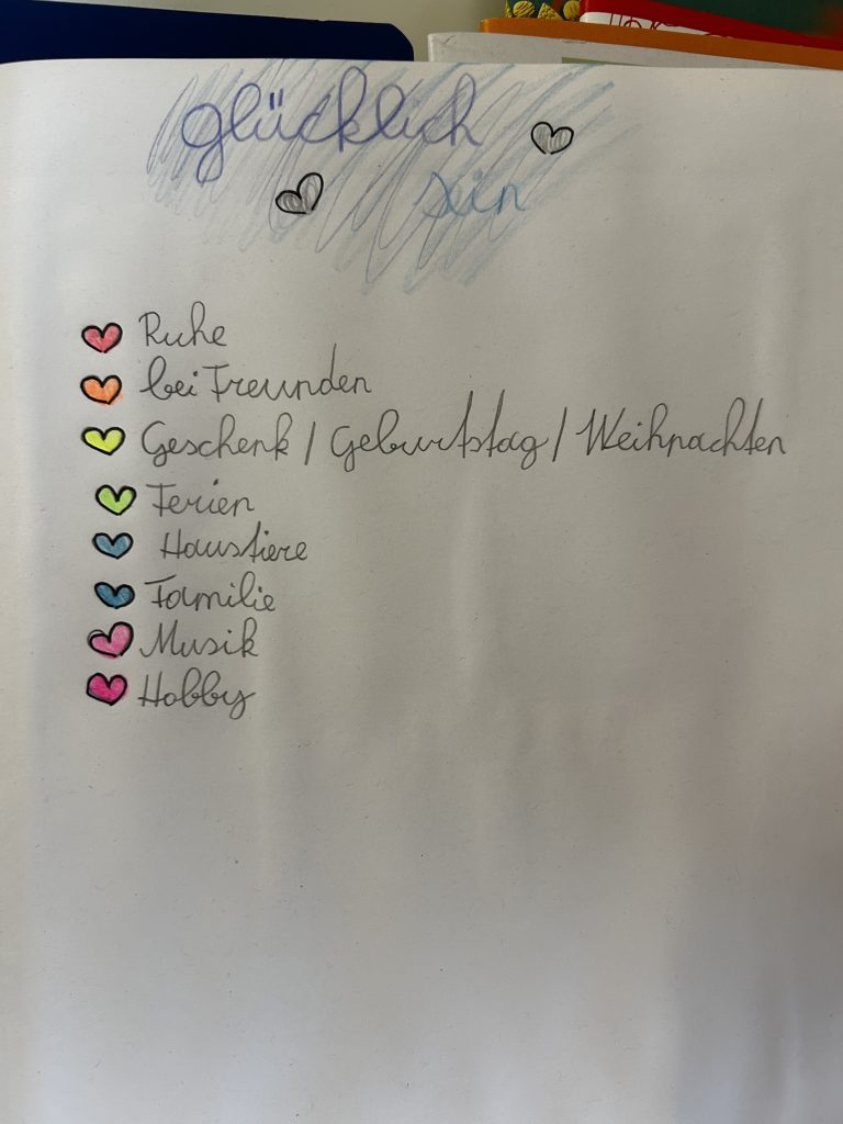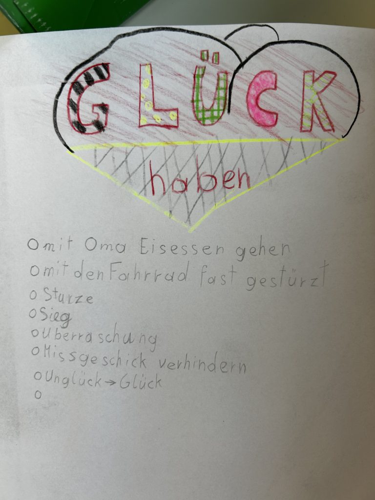 In der unverbindlichen Übung GLÜCK, die die Schülerinnen und Schüler der 4. Klassen wählen können, wird mit Igelbällen massiert, über „Glück haben“ und „glücklich sein“ philosophiert, werden Fantasiereisen durchgeführt, und Bücher und Geschichten zum Thema vorgelesen. Auch präsentieren wir unsere Gedanken immer wieder an einer Pinnwand und gestalten auch Dekorationen mit Botschaften im Schulhaus.