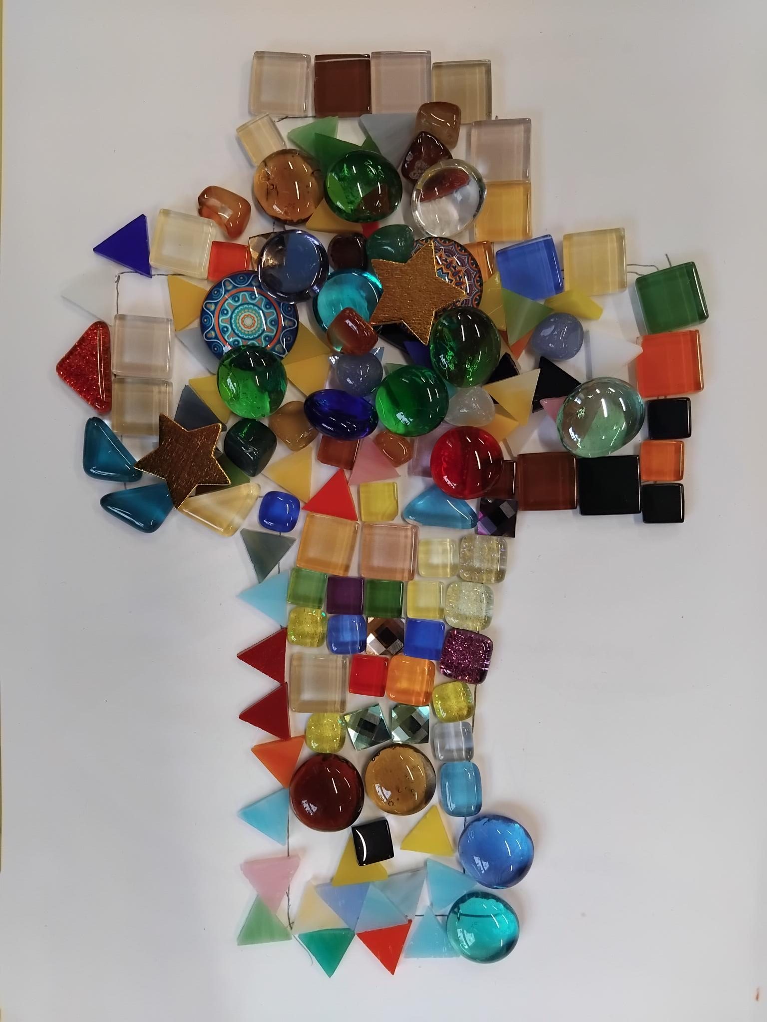 Die Schülerinnen und Schüler der 1. Klassen haben sich die letzten Stunden mit dem Kreuz beschäftigt. Wir haben mit unseren Körpern ein Kreuz gemacht, sowie aus Papier. In der Stillarbeit konnte dann jedes Kind sein/ihr Kreuz mit Glassteinen, Filz und Holz verzieren.