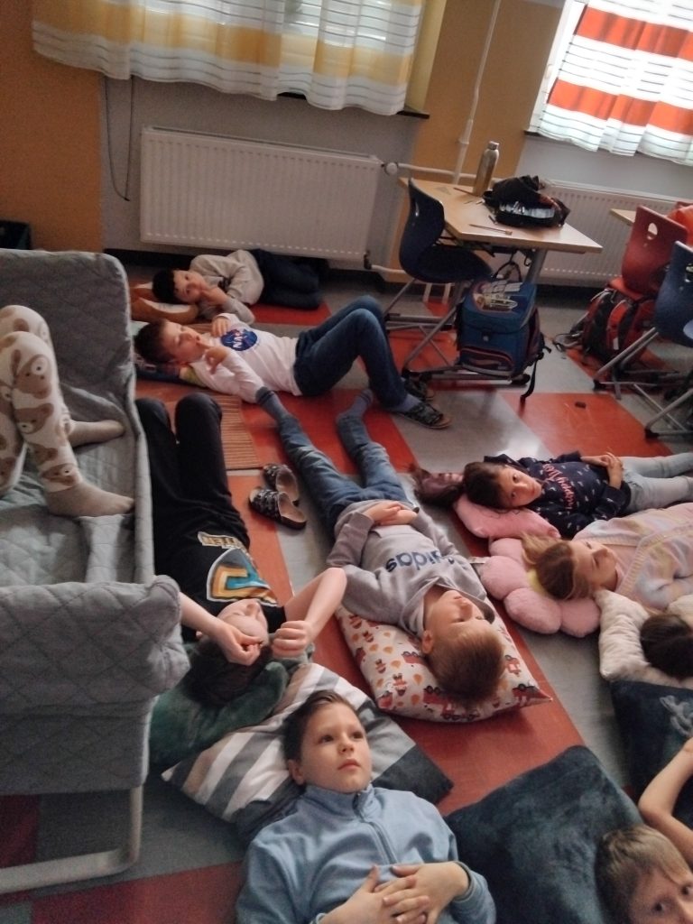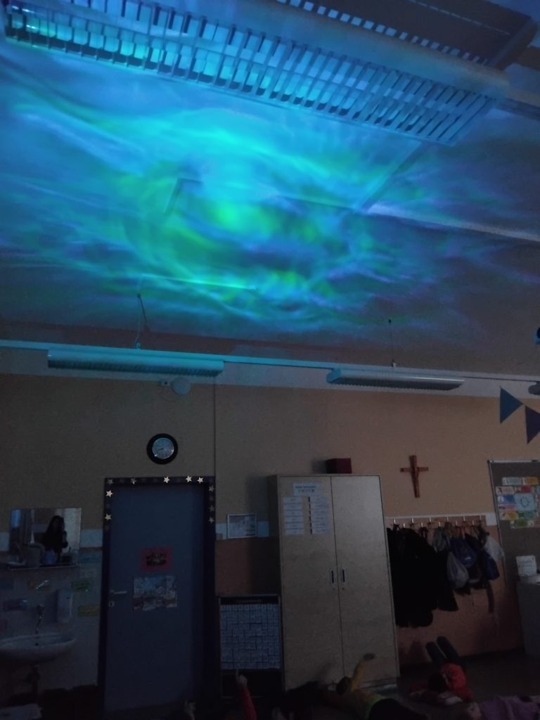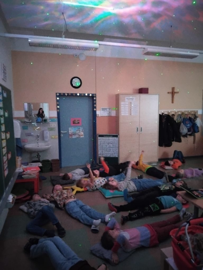 Im Religionsunterricht konnten die Schülerinnen und Schüler diesem Versprechen Gottes nachspüren, indem sie selbst einen Sternenhimmel im Klassenzimmer betrachten konnten. Staunend lagen sie am Boden und genossen diese einzigartigen Minuten.